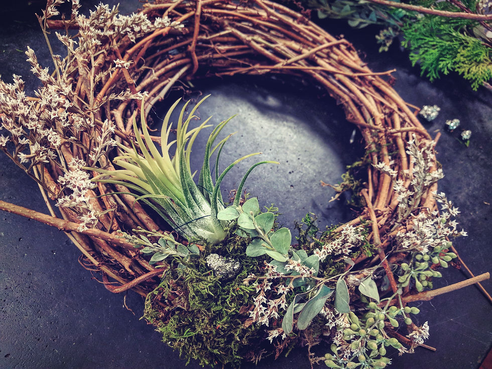 Dried flower, preserved moss and some fresh cut evergreen and air plants were used.
